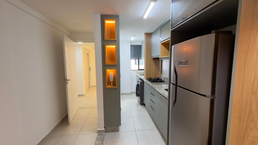 - Cozinha completa, com planejados, geladeira, fogão cooktop, máquina de lavar roupas, lava e seca, microondas;