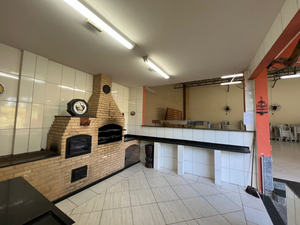 Salão de festas com lareira, churrasqueira e cozinha industrial;